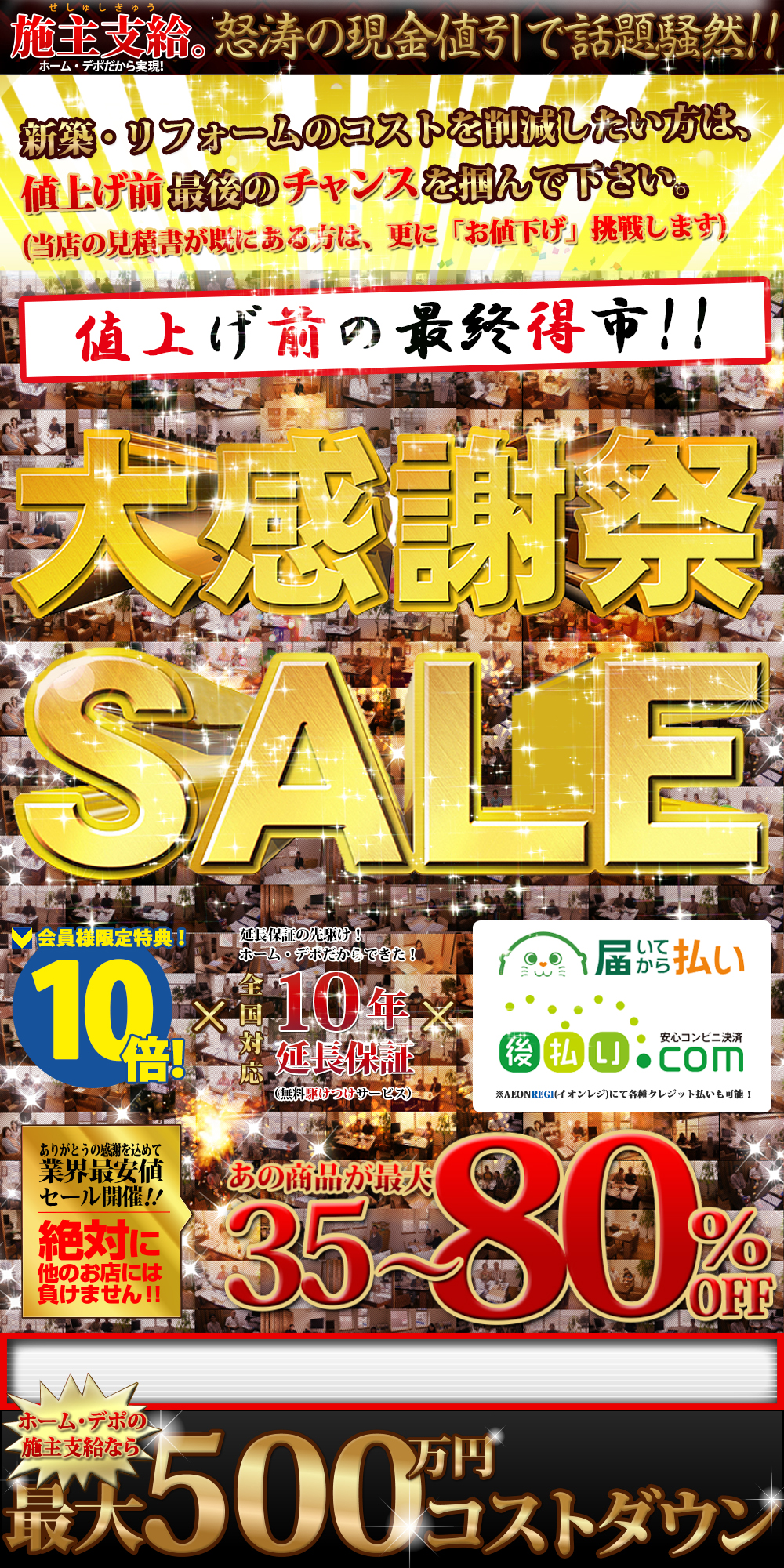 ホーム・デポではシステムキッチンやシステム(ユニット)バスなどの住宅設備や各種建材の販売他、リフォーム・新築全般もお受けしておりますが、消費増税以降もおかげ様で…(続きを読む)